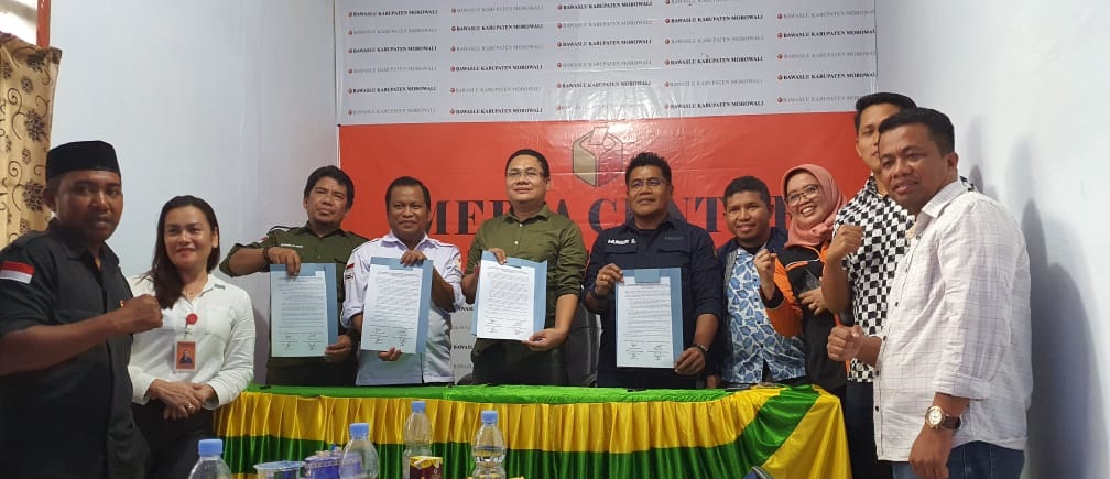 Anggota Bawaslu Sultra Munsir Salam dan Bahari serta Ketua Bawaslu Kab. Konawe Utara bersama Anggota Bawaslu Sulawesi Tengah serta Anggota Bawaslu Kab. Morowali sedang menandatangani Nota Kesepakatan Bersama terkait Potensi Kerawanan Pemilih di Daerah Perbatasan dalam Pilkada 2020, Morowali (4/3/2020)/Foto: LD Ngkumabusi