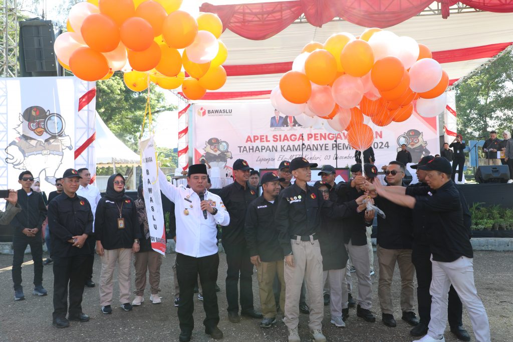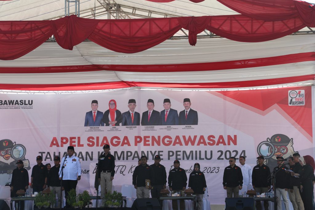 Kota Kendari, Badan Pengawas Pemilihan Umum Provinsi Sulawesi Tenggara €“ Bawaslu Sultra Gelar Apel Siaga Tingkat Provinsi Pengawasan Tahapan Kampanye Pemilu Tahun 2024, pada hari hari Minggu, 03 desember 2023 dan bertempat di Lapangan Eks-MTQ, Kendari, Sulawesi Tengara /Foto: (Humas Bawaslu Sultra).