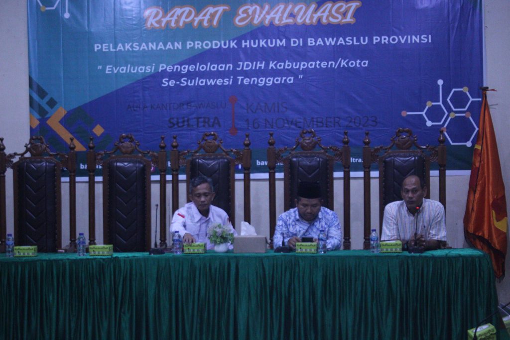 Kota Kendari, Badan Pengawas Pemilihan Umum Provinsi Sulawesi Tenggara €“ Gelar Pembukaan Kegiatan Rapat Evaluasi Pelaksanaa Produk Hukum di Bawaslu Provinsi dengan Tema Evaluasi Pengelolaan JDIH Kabupaten/Kota Se - Sultra, pada hari Kamis, 16 November 2023 di Aula Sekretariat Bawaslu Provinsi Sulawesi Tenggara /Foto : (Humas Bawaslu Provinsi Sulawesi Tenggara).