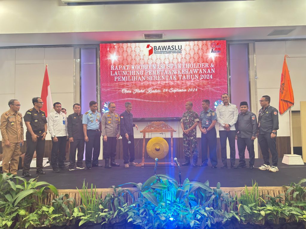 Kota Kendari, Badan Pengawasan Pemilihan Umum Provinsi Sulawesi Tenggara gelar pembukaan kegiatan Rapat Koordinasi Stakholder dan Launching Pemetaan Kerawanan Pemilihan Serentak Tahun 2024, pada hari Senin, tanggal 09 September 2024 bertempat di Hotel Claro Kendari/Foto : Humas