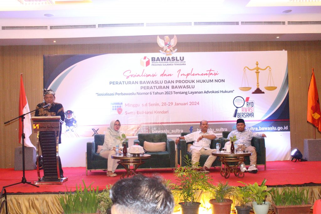 Kendari, Badan Pengawas Pemilihan Umum Provinsi Sulawesi Tenggara, Gelar Pembukaan kegiatan Sosialisasi dan Implementasi Peraturan Bawaslu dan Produk Hukum non Peraturan Bawaslu pada hari Minggu, 28 Januari 2024 di SwissBell Hotel Kendari di Kota Kendari Provinsi Sulawesi Tenggara/Foto: (Fandi).