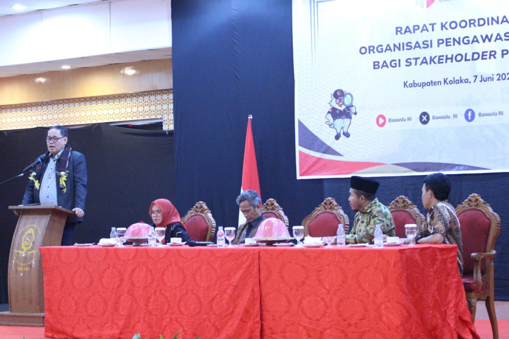 Anggota Bawaslu Herwyn JH Malonda dalam kegiatan Rapat Koordinasi Organisasi Pengawas Pemilu Bagi Stakeholder Bawaslu di Kolaka, Jumat (7/6/2024). Foto (Wawan/Putri Anti wiwing)
