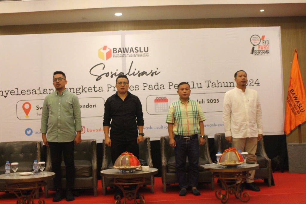 Kota Kendari, Badan Pengawas Pemilihan Umum Provinsi Sulawesi Tenggara €“ Pembukaan Kegiatan Sosialisasi Penyelesaian Sengketa Proses Pada Pemilu Tahun 2024, pada hari Jumat, 14 Juli 2023 di Swiss Bell Hotel Kendari/Foto : (Wawan /Humas Bawaslu Provinsi Sulawesi Tenggara).
