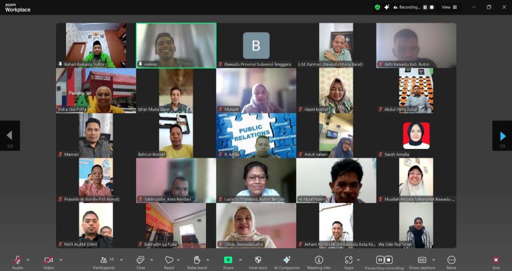 Kegiatan yang dilaksanakan secara virtual melalui Zoom ini menghadirkan Wawan, Staf Bawaslu Kabupaten Kolaka Timur sebagai moderator. Dalam pengantarnya, Wawan menekankan pentingnya optimalisasi peran humas di masa non tahapan, merujuk pada Surat Keputusan Bawaslu RI Nomor 38 Tahun 2022 tentang pengelolaan media sosial.