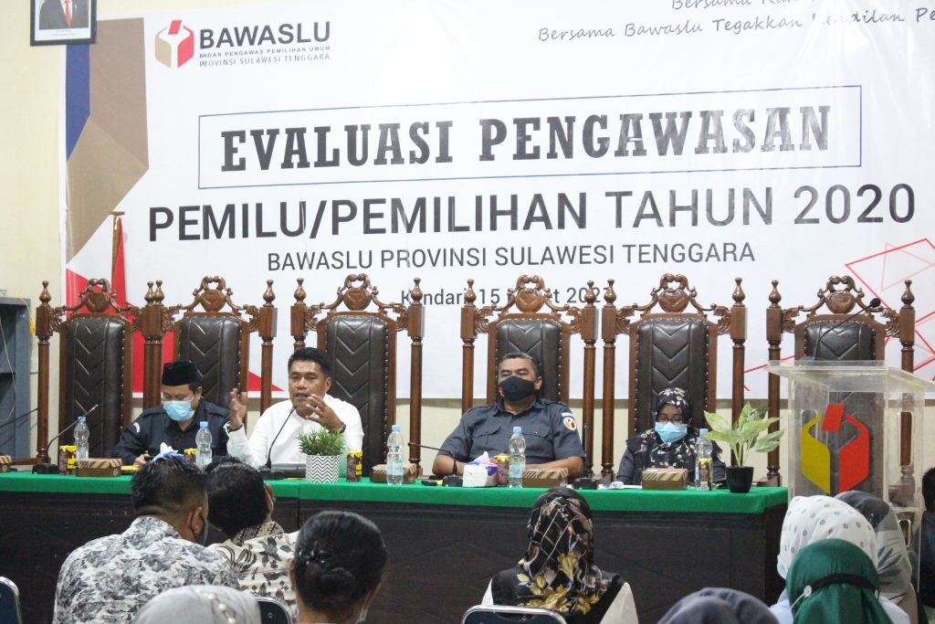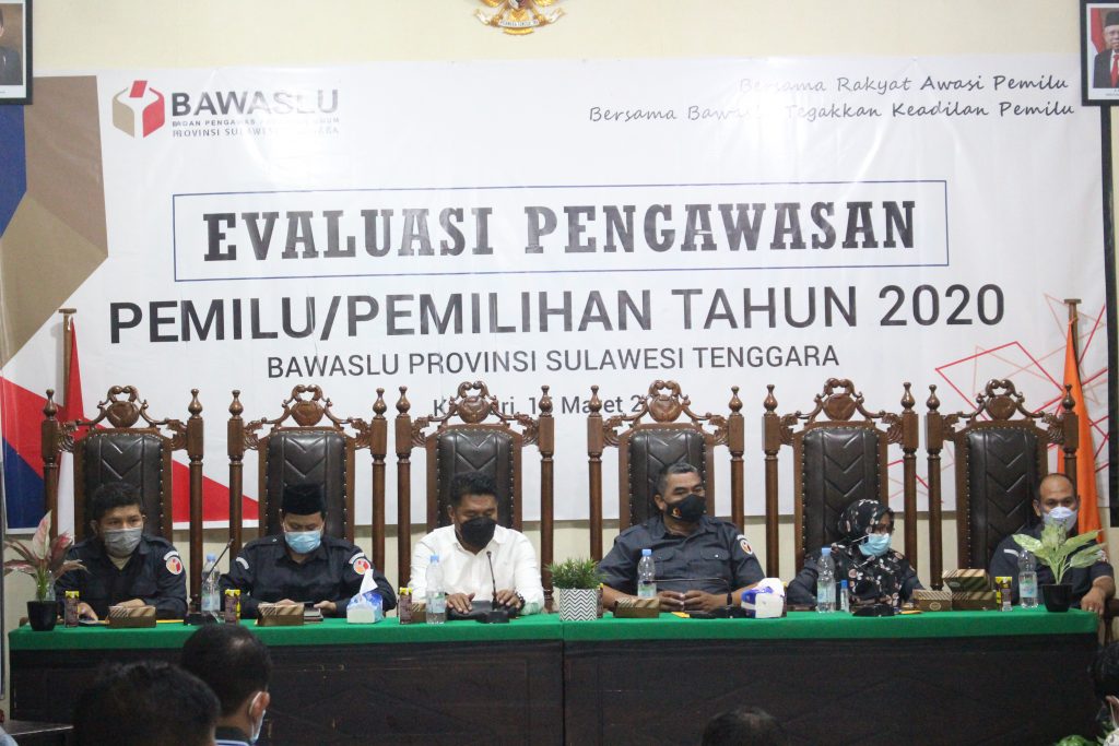 Kendari, Badan Pengawas Pemilihan Umum Provinsi Sulawesi Tenggara €“ Demi terlaksanakanya penguatan dan refleksi pengawasan Pemilu maupun Pemilihan di tahun 2020 serta kesiapan SDM dalam melakukan pengawasan di Pemilu/Pemilihan yang akan datang, Bawaslu Sultra adakan kegiatan Evaluasi Pengawasan Pemilu/Pemilihan Tahun 2020, Senin (15/03/2021) di aula Kantor Bawaslu Sultra.